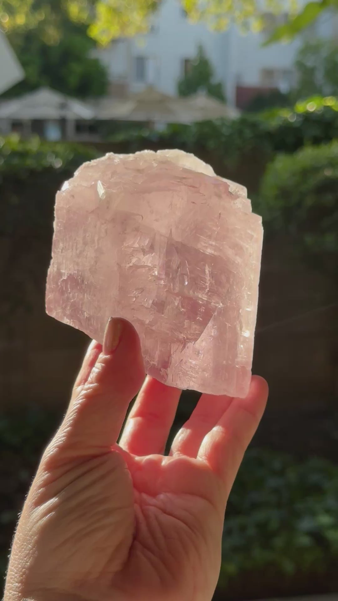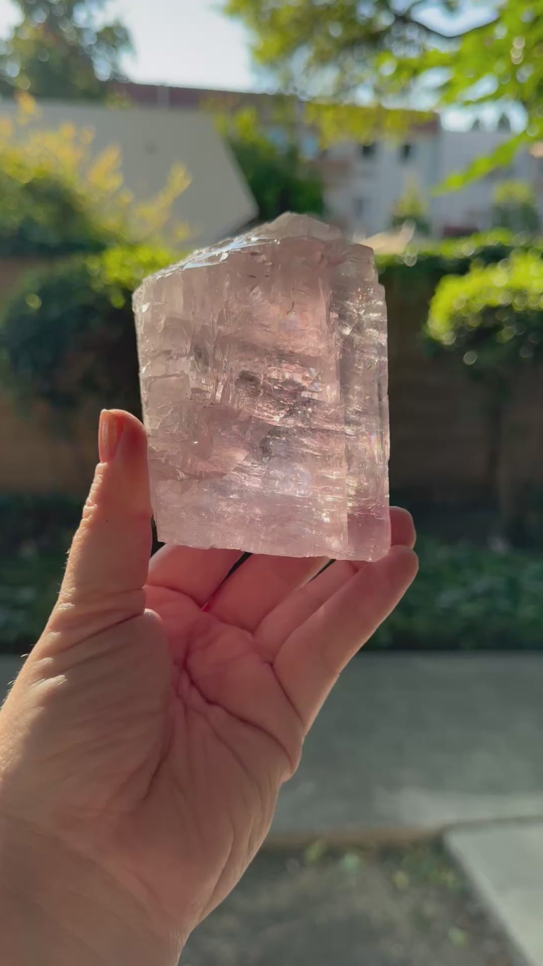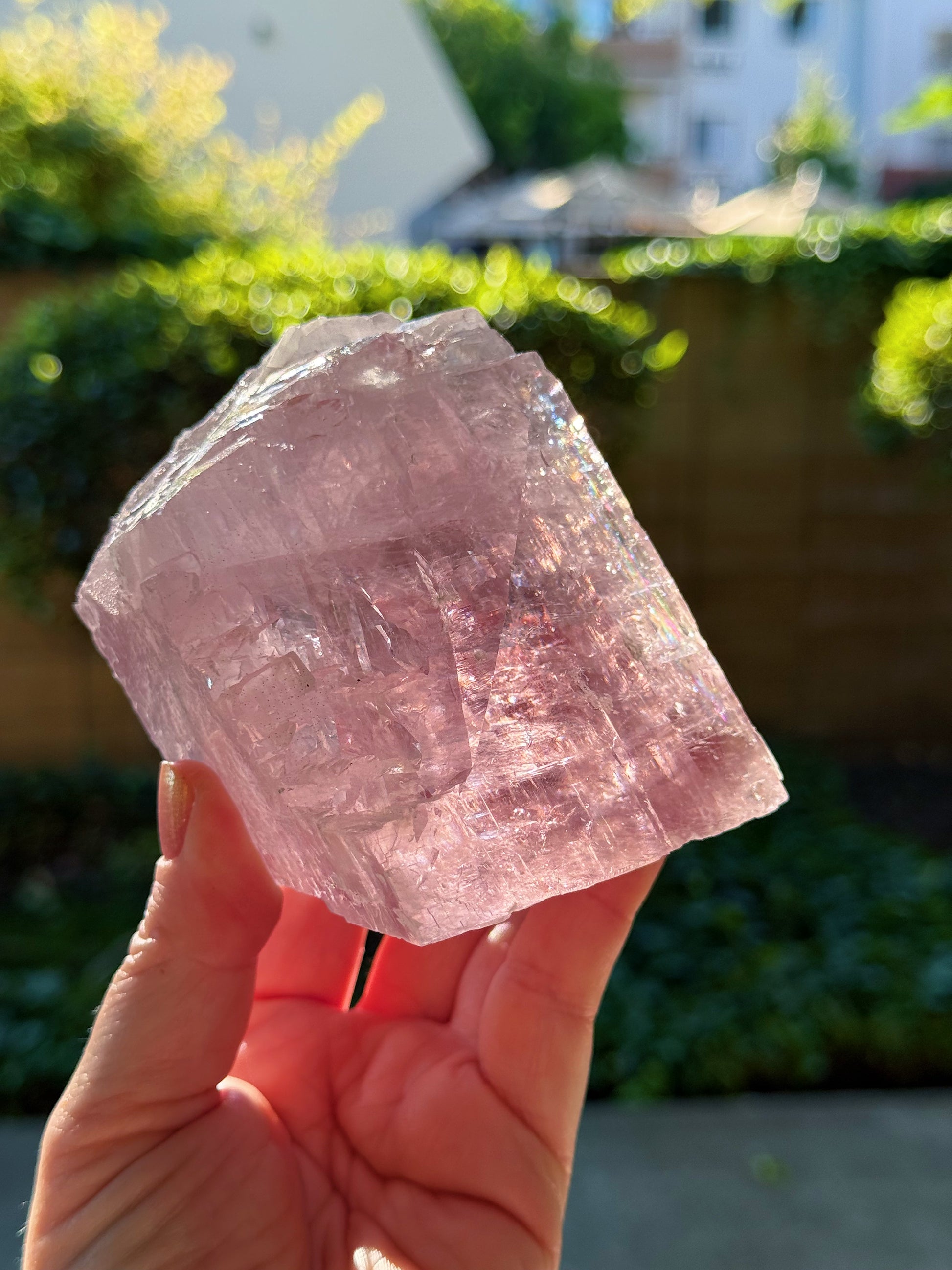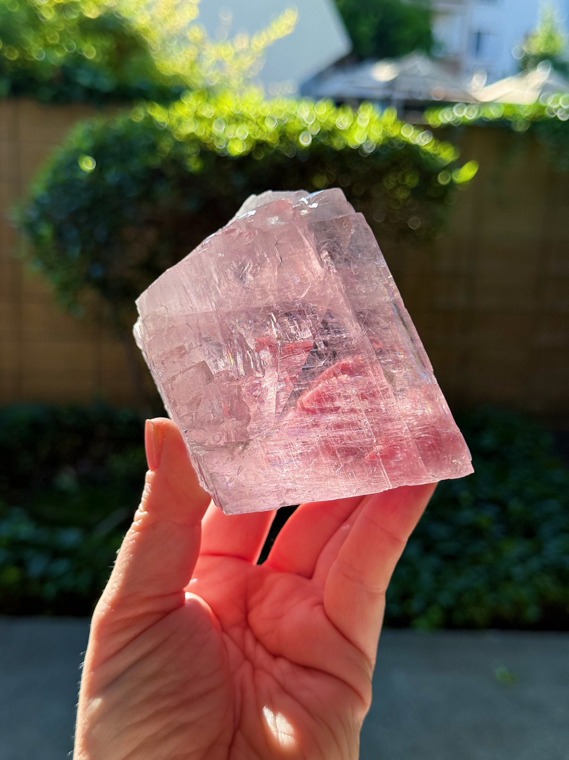 A Balmat Calcite from the Empire Zinc Mine in NYC. Personal destash because I don’t need two of them. 😭Very, very pink in person. Not one of the fainter ones at all. Some really beautiful rainbows at the core. Super gemmy piece too!