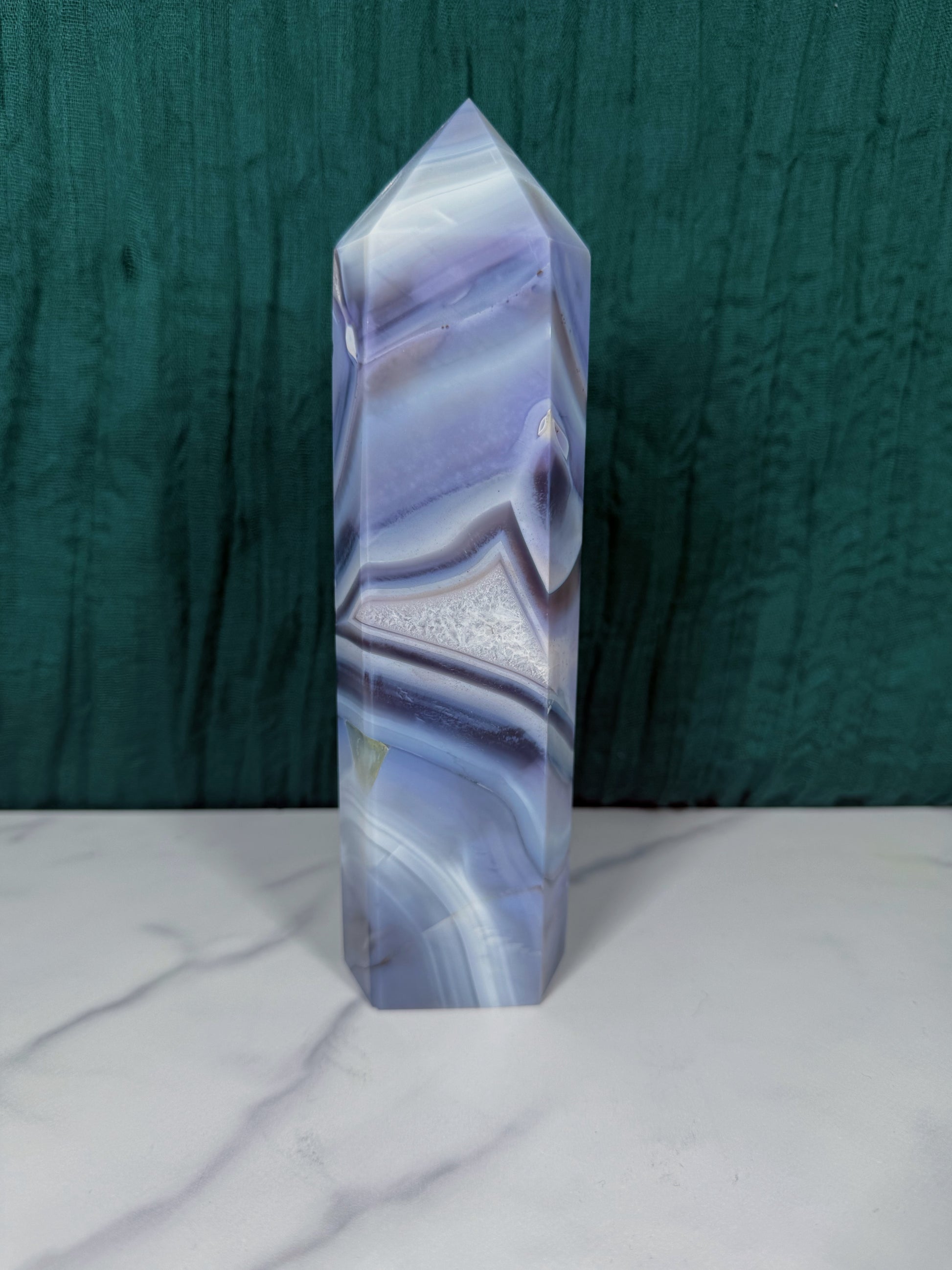 Vibrant Blue Agate tower with a pocket of druze in the middle. 7.2 by 3 inches.