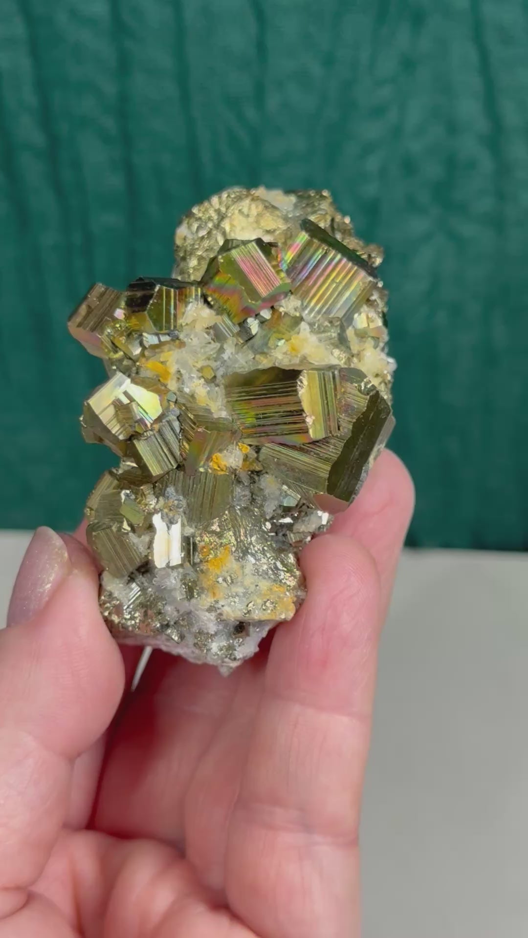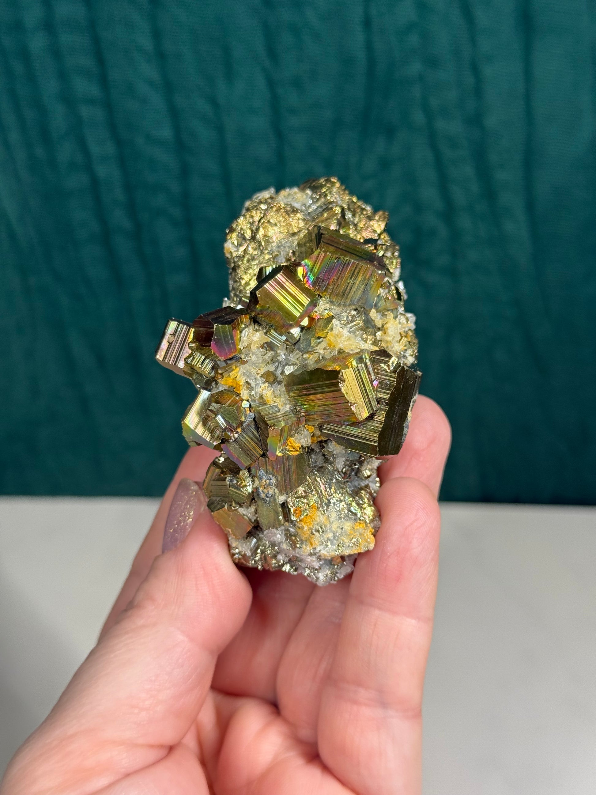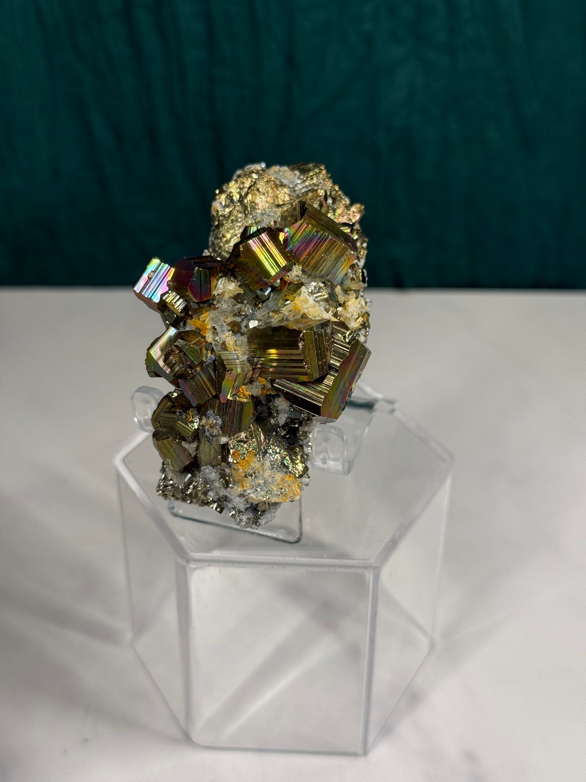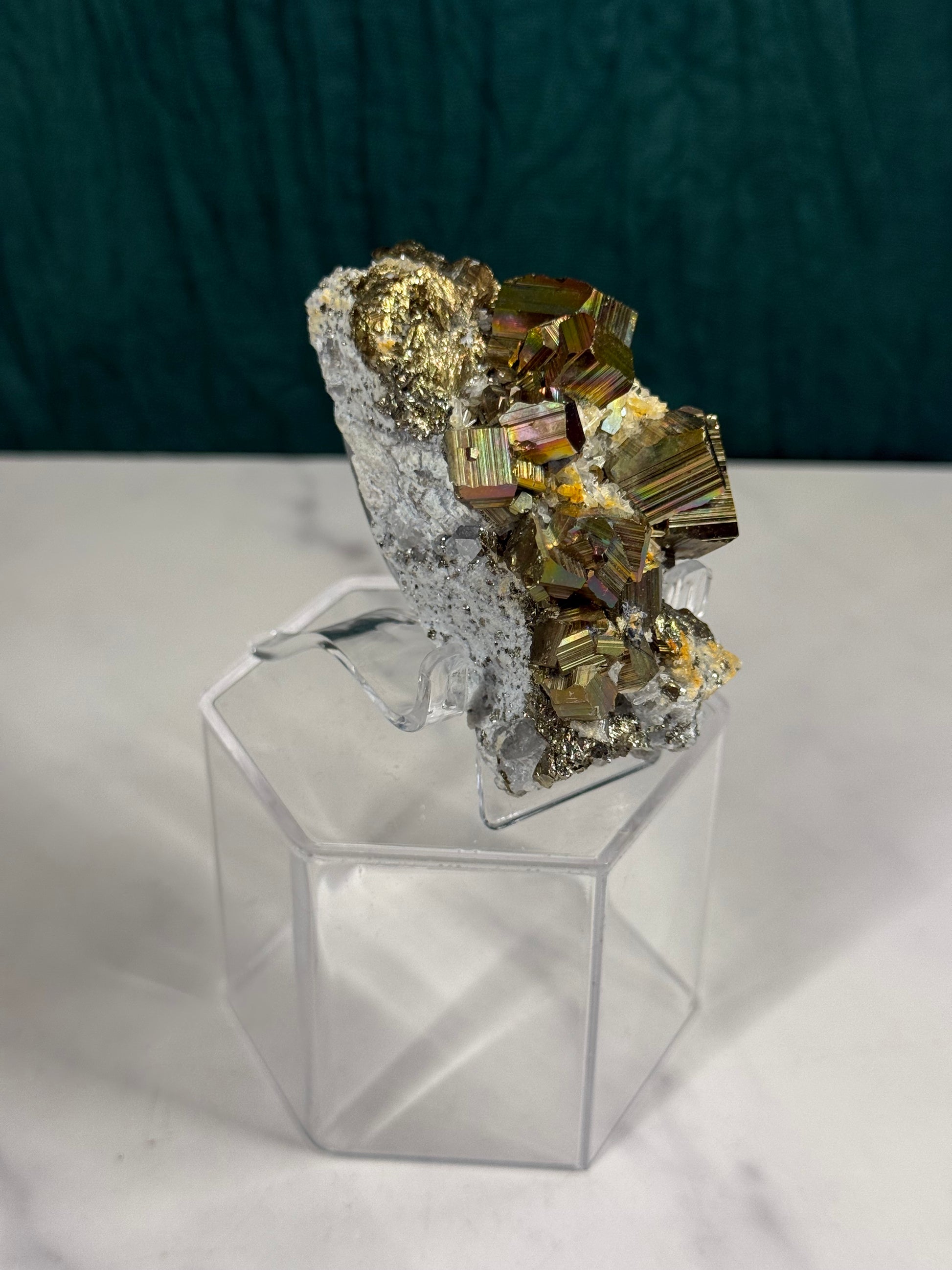 Iridescent Octahedral Pyrite on Quartz