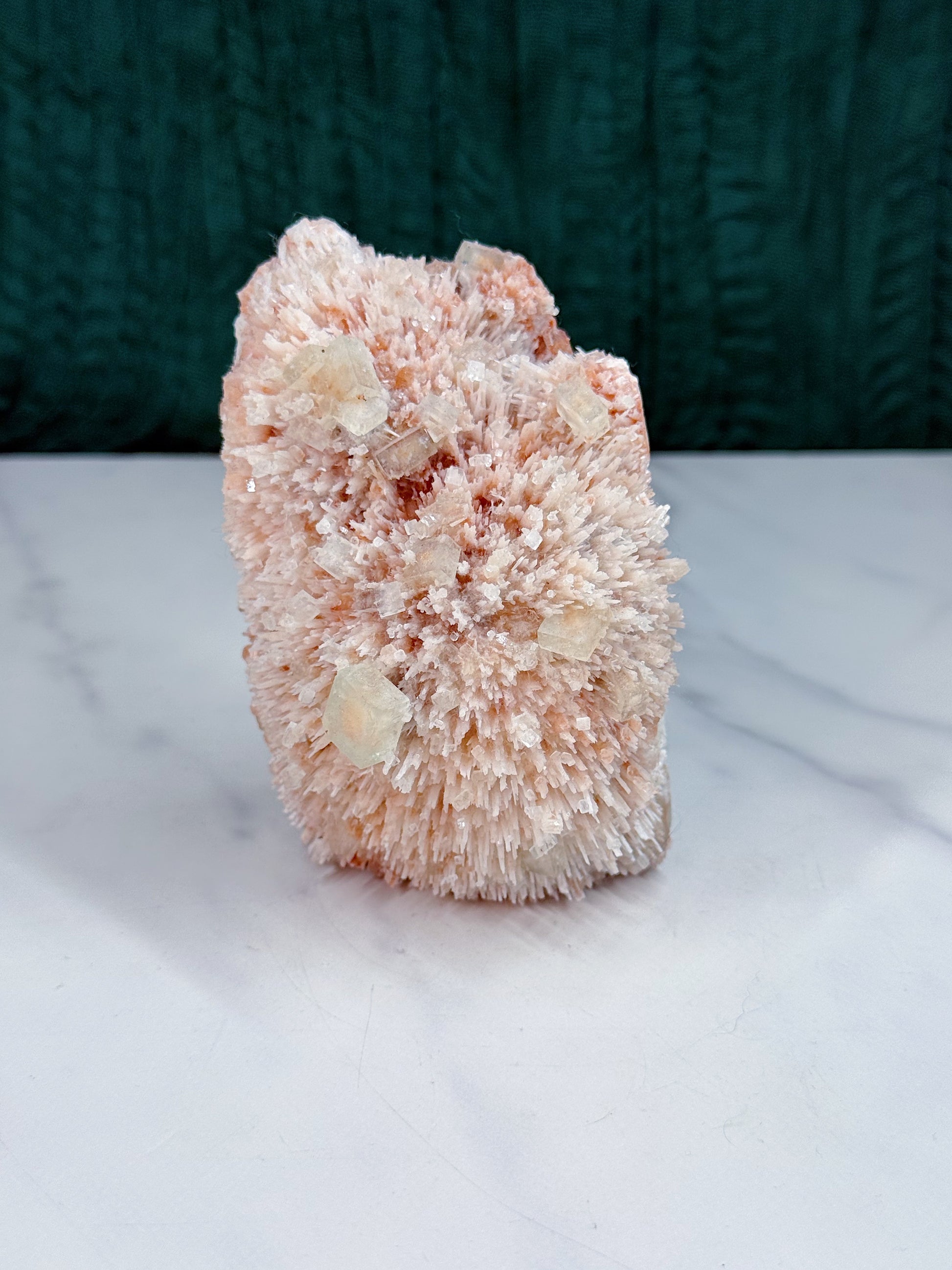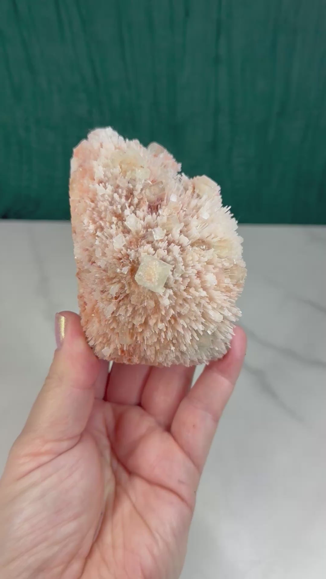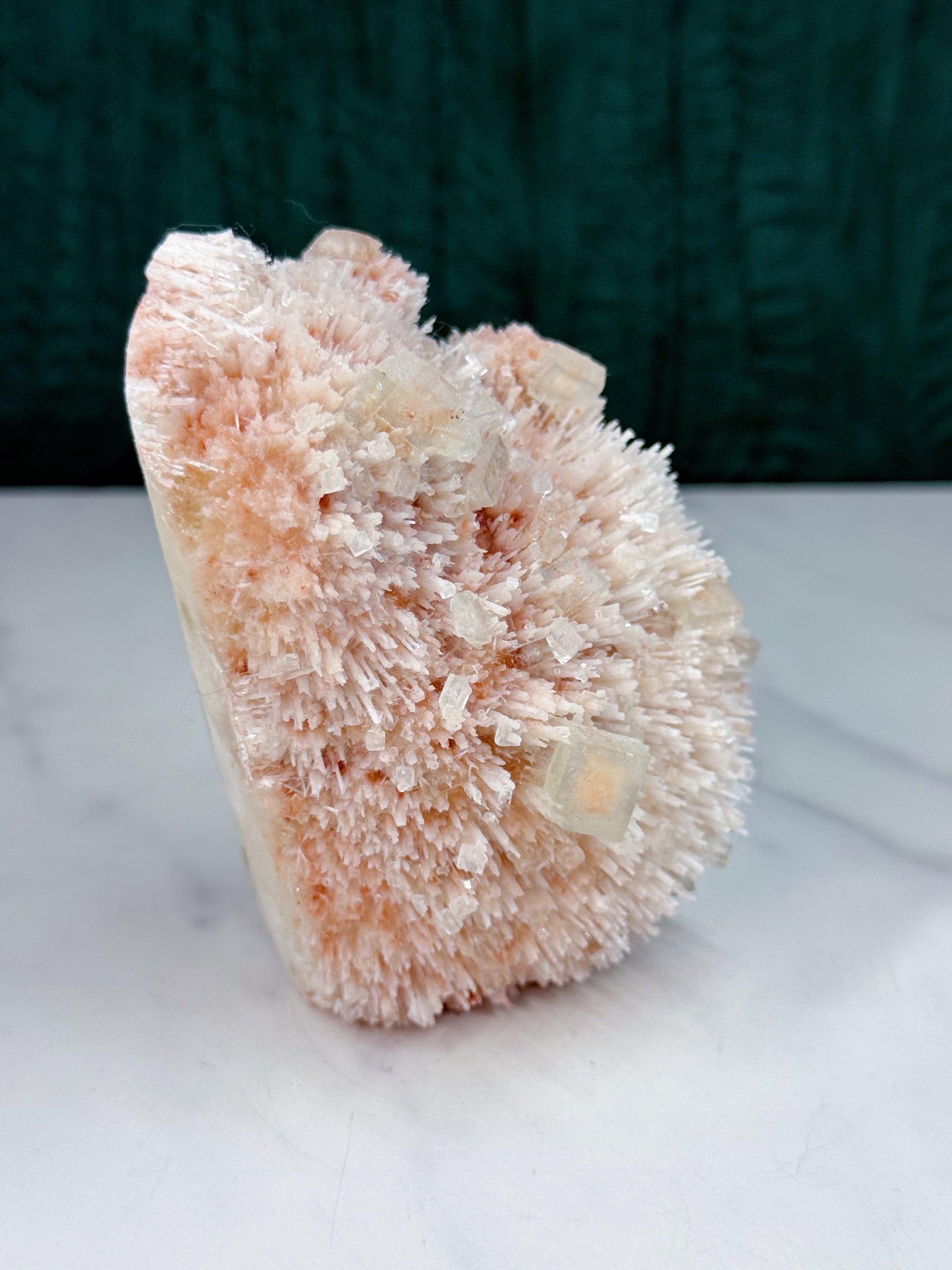 Pink Mordenite, red hematite and green apophyllite cutbase. So cool and aesthetic!