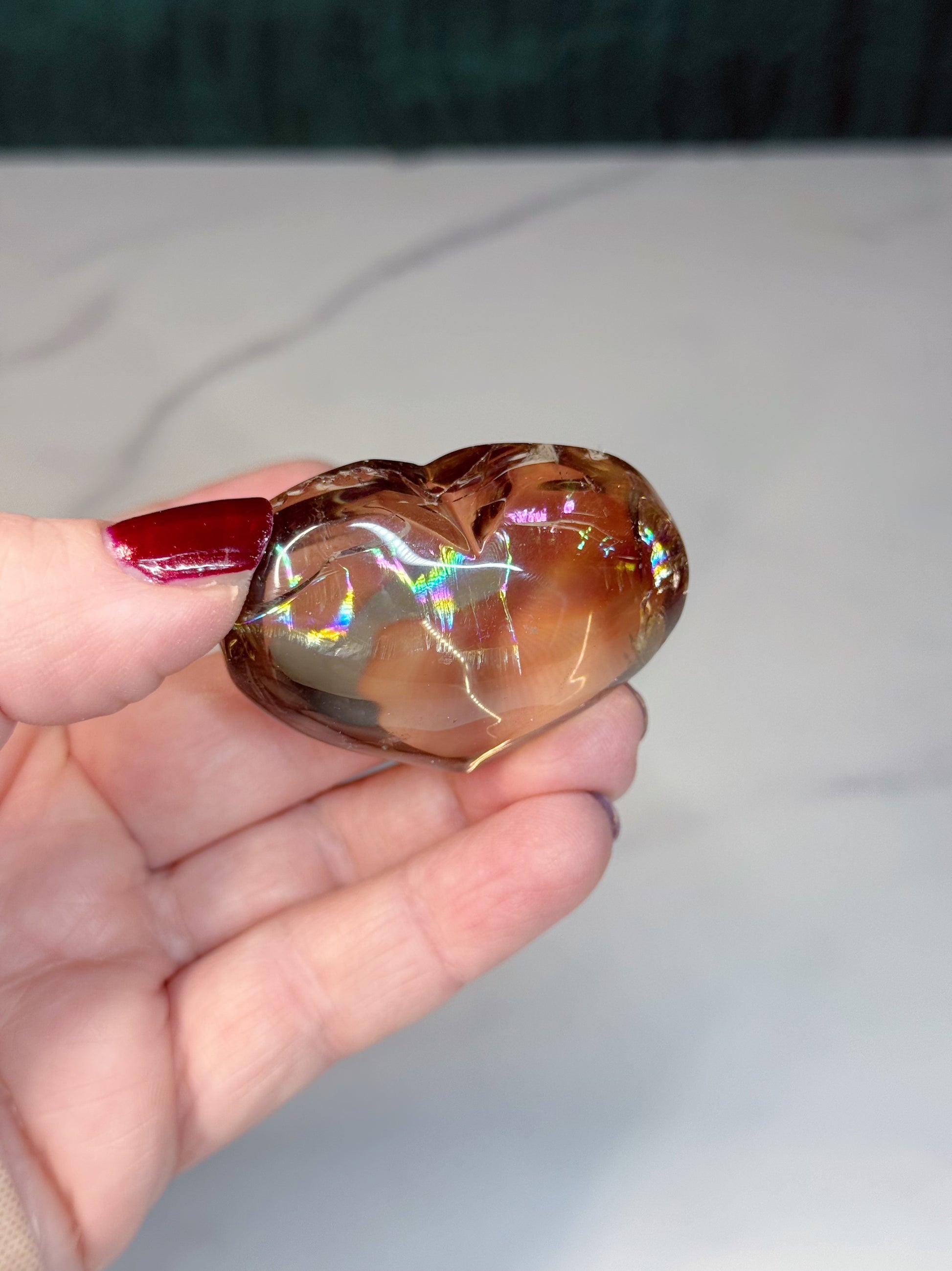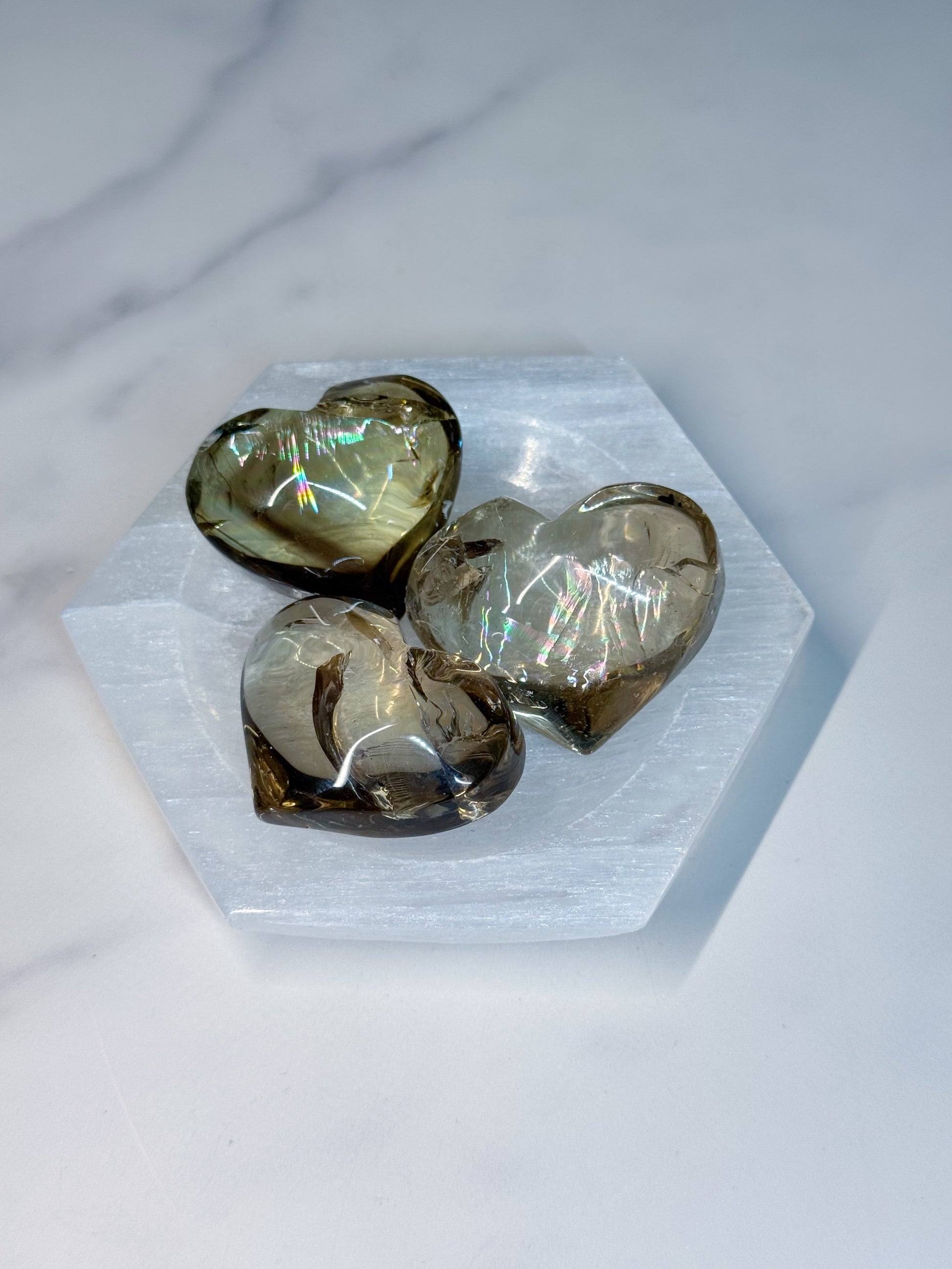 Smoke quartz puffy heard with massive rainbow in each piece.